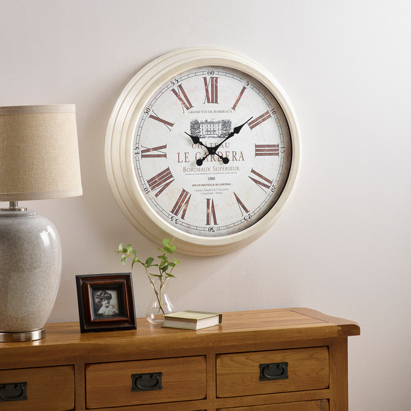 The Gardera clock has a vintage painted style that will add the finishing touch to your chic interior style. The face features large Roman numerals with smaller Arabic numbers, and has a charming application of a wine label with Chatau illustration for decoration. This cream-framed clock will look stunning in your living room, dining room, hall or kitchen, really adding style. French shabby chic style Roman numerals Dark brown numbers on distressed white background Requires 1 x AA battery (not supplied) (W) 70cm x (H) 70cm x (D) 9cm