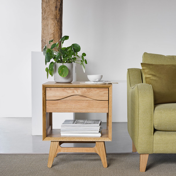 Handy at the end of a sofa or by an armchair, the Ellipse side table is smooth to touch and compact in style. It has a mitred outer frame, and softened, curved base frame and legs. The upper drawer has a sculpted handle, sitting above a lower shelf. Designed by us with a Scandi influence, our Ellipse range is solid oak, made using classic carpentry. It's built to last.