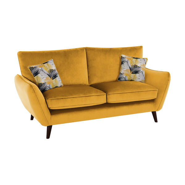 Indulge in some mid-century style in softest velvet, with Fern. This range welcomes you with low, open arms. Sofas, armchair and footstool are upholstered in solid shades of velvet. Scatter cushions and accent footstool are covered in a fabric featuring line drawings of leaves. Toning colours harmonise with each velvet. The retro look is also found in the tapered, longer legs, made from hardwood
