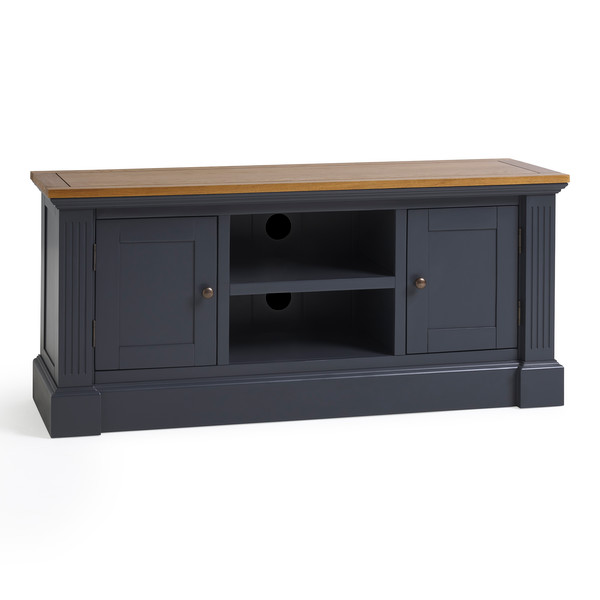 Strongly made furniture that looks good, every day, that's what we make. And this Highgate blue large TV unit helps keep media clutter under control. Two cupboards and central shelf keep things contained. With holes cut for cables, it's delivered ready to use. Inky blue paint tones with rustic oak and copper coloured handles. 100% hardwood all through, it looks great, and it's made for life.
