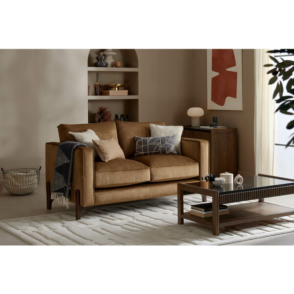 Inspired by elegant mid-century design, our modern Jude 2-seater sofa is available in either a soft textured or luxurious velvet-look upholstery for a sophisticated living room aesthetic. The range is elevated on exposed beech wooden legs in a walnut or natural finish, which allows you to create your ideal look. Other features include tall box arms and comfortable sink-in cushions with piping detail, plus two complementary statement scatter cushions.