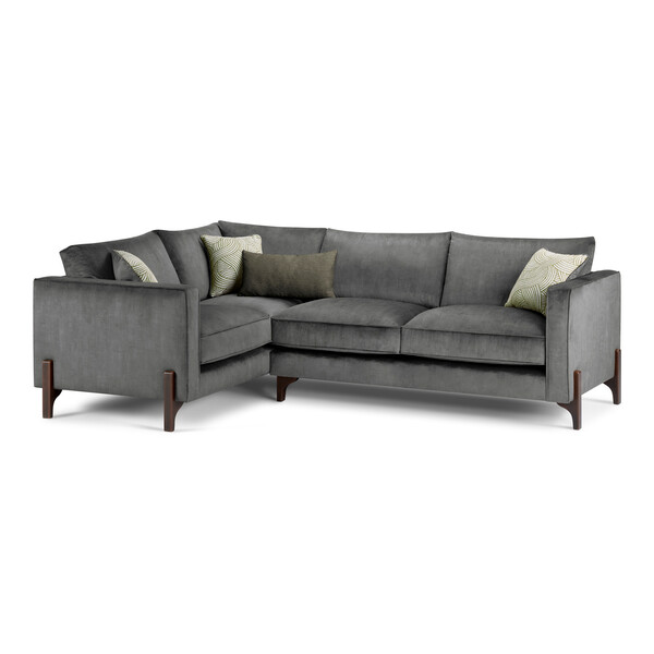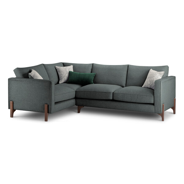 Fall for chic mid-century style and create your everyday luxe resting nook with our Jude right-hand corner sofa. The exclusive design is raised on exposed beech wooden legs in either a walnut or natural finish, while tall box arms and comfortable sink-in cushions feature piping details. Three complementary statement scatter cushions and two luxe bolsters add to Jude's modern charm. A choice of soft textured or rich velvet-feel upholstery options in a range of colours means you can make a statement or go for a subtle perfect match.