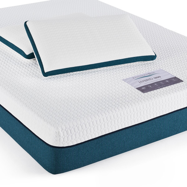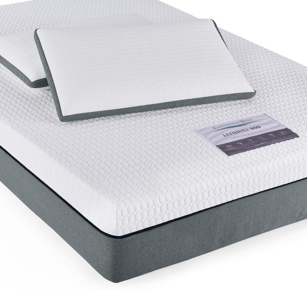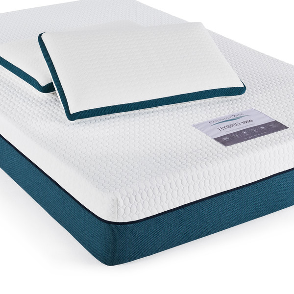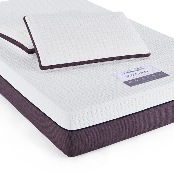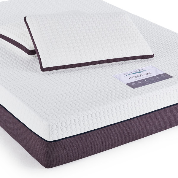 Hybrid style, modern super king-size mattress and two pillow bundle Comprises supportive pocket springs and 60mm deep comfort layer Comfort and temperature control given by specialist foam layers Superior air flow through open cell foam structure Unique foam base works with bed frame for support Comes with two foam-filled pillows Designed with removable and washable top cover Delivered in a roll unfurl once home Our super king-size Hybrid 600 mattress comes with matching foam-filled pillows. This kind of mattress style combines pocket springs and a 60mm comfort layer, covered with a modern grey and white cover. The top layer helps air flow and temperature control with its open cell foam structure. The cover top zips off to machine wash. For a great night's sleep, team with one of our bed frames.