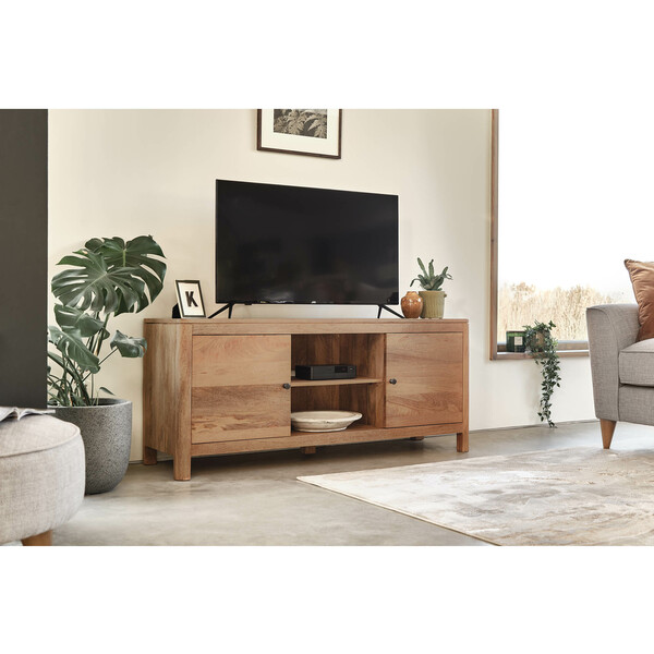 Ideal for cosy living spaces, the Lyla small mango wood TV unit is the perfect addition to help you wind down and watch your favourite series. It features a handy cupboard to keep remotes and more, while the open shelving offers storage for all your entertainment essentials. With its soft curved edges and gunmetal grey round handle, the design combines classic and contemporary design youll enjoy for years to come. The beautiful colour variations of the mango wood make every piece unique and bring pleasing warm tones to your living room.
