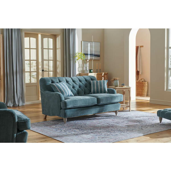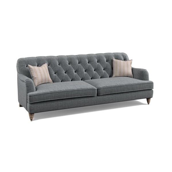 Introduce timeless made-to-last style with our elegant 3-seater Stanley sofa. The Chesterfield-inspired design sits on solid oak spun legs and features button-back details and low pleated curved arms. Upholstered in a super-soft woven fabric in a choice of six colours, Stanley comes with complementary stripe scatter cushions for added comfort. For extra elegance and modern farmhouse style, match with our Newton cabinetry range.