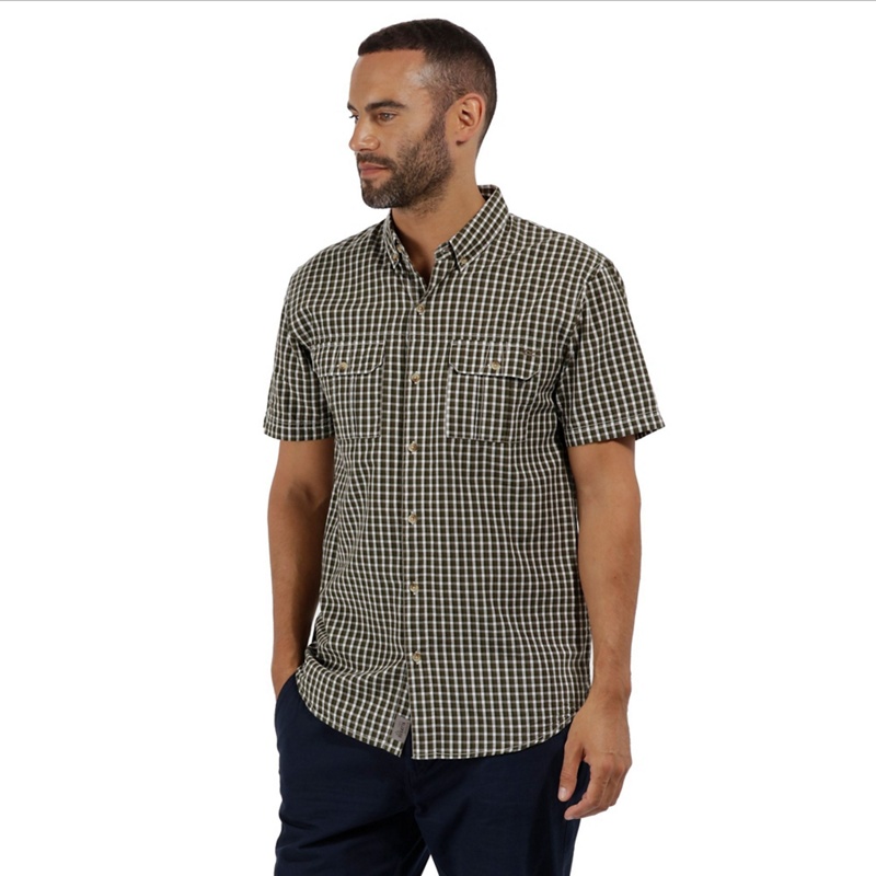 The men's 'Kalambo' short sleeve technical shirt from regatta is made of high-wicking woven polyester fabric with an all-over check pattern and the small regatta tab on the chest. Size:M Colour:Blue