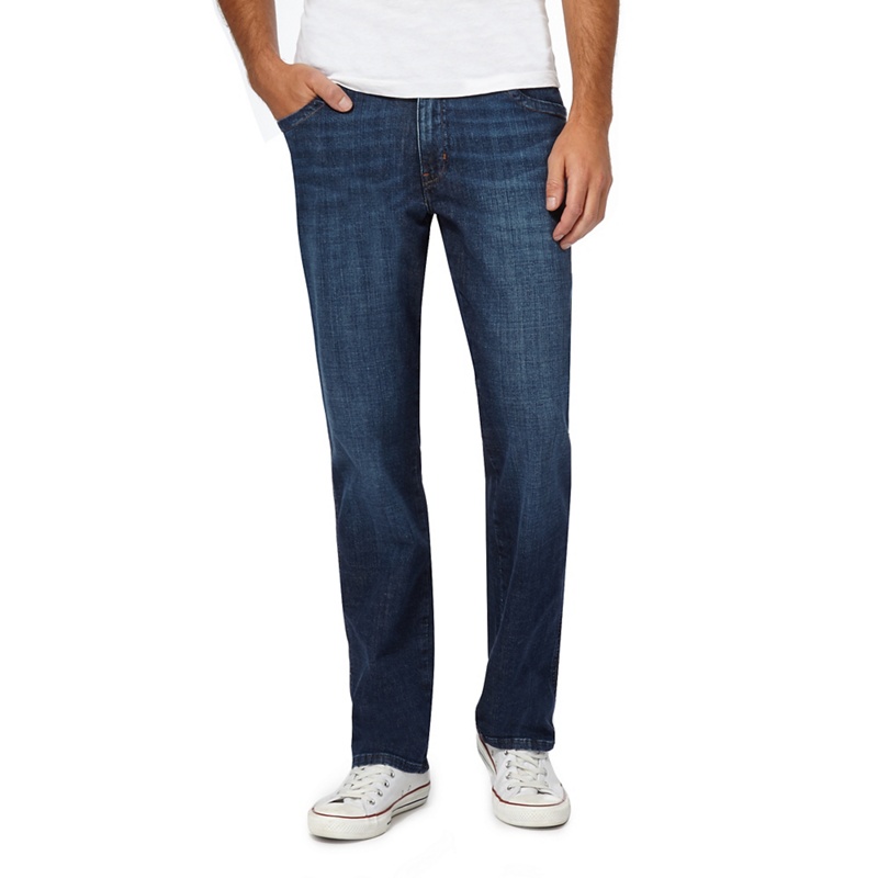 Texas Stretch Jeans by Wrangler features open front zip fly, belt loops and front pockets with a small coin pocket to the right side. This pair of jeans for men in Darkstone Blue colour has rear pockets with stitching details and a stitched brand tab to the right pocket.