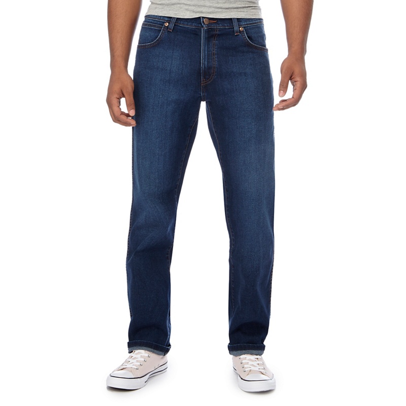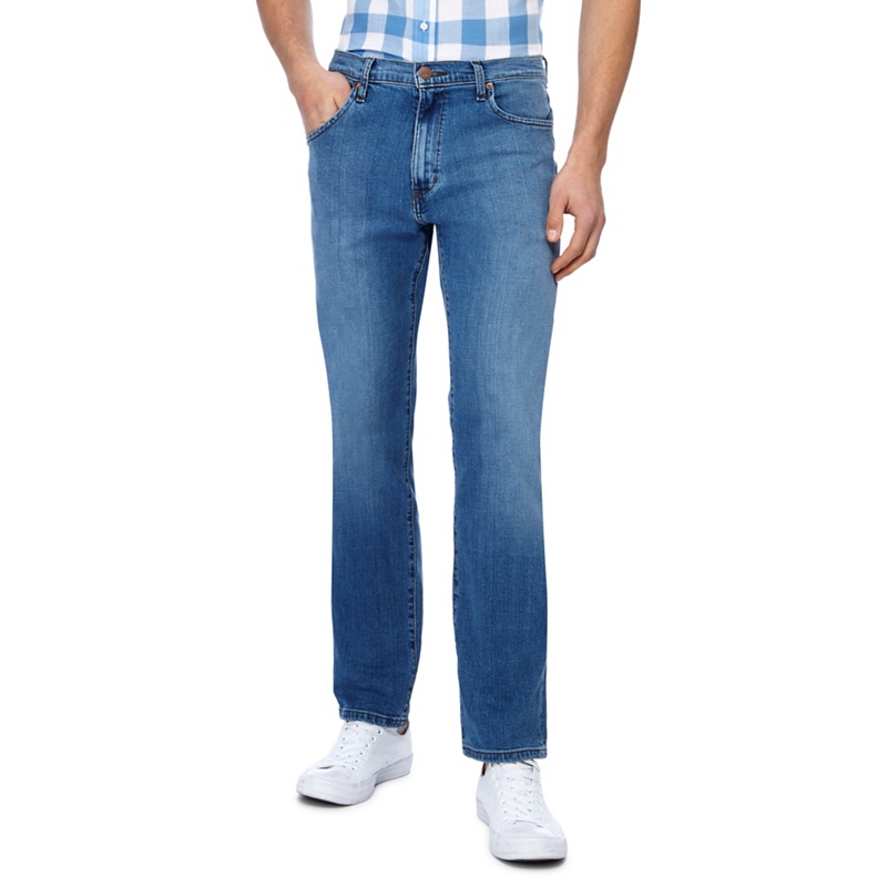 These straight leg jeans from Wrangler are a man's off-duty essential. In a blue mid wash finish, they feature the brand's iconic branded patch and are made from cotton stretch materials for all-day comfort. Also available in big and tall sizes. Size:32R Colour:Blue